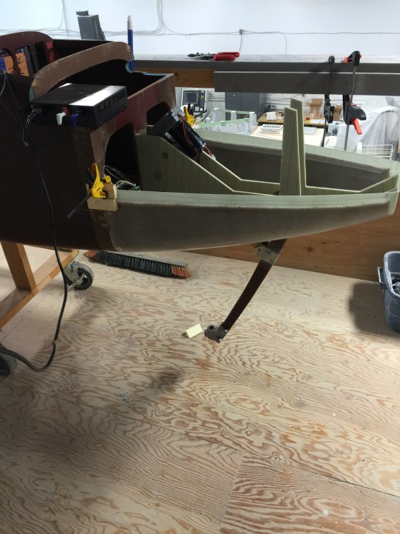 This is the gear extended. I will now have to put the main gear on and check my geometry before I permanently start attaching the nose to the fuse. It will be exciting to have the nose all finished as it will finally start to look like an airplane or at least to those who know what a long-ez looks like.