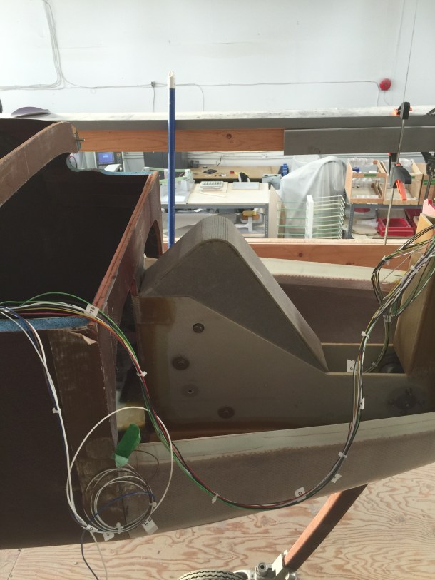 I have only rough trimmed the cover so it will require a little more beautification. I also haven’t decided what fasteners I will use to hold it in place so I will have to figure that out. The last remaining hole on the top of the NG 30s will be caped off but that won’t happen until I final glass the top half of the nose on. I intend to put a layer of glass the ties the top of the bulkheads to the door opening so you will have to wait to see that one.