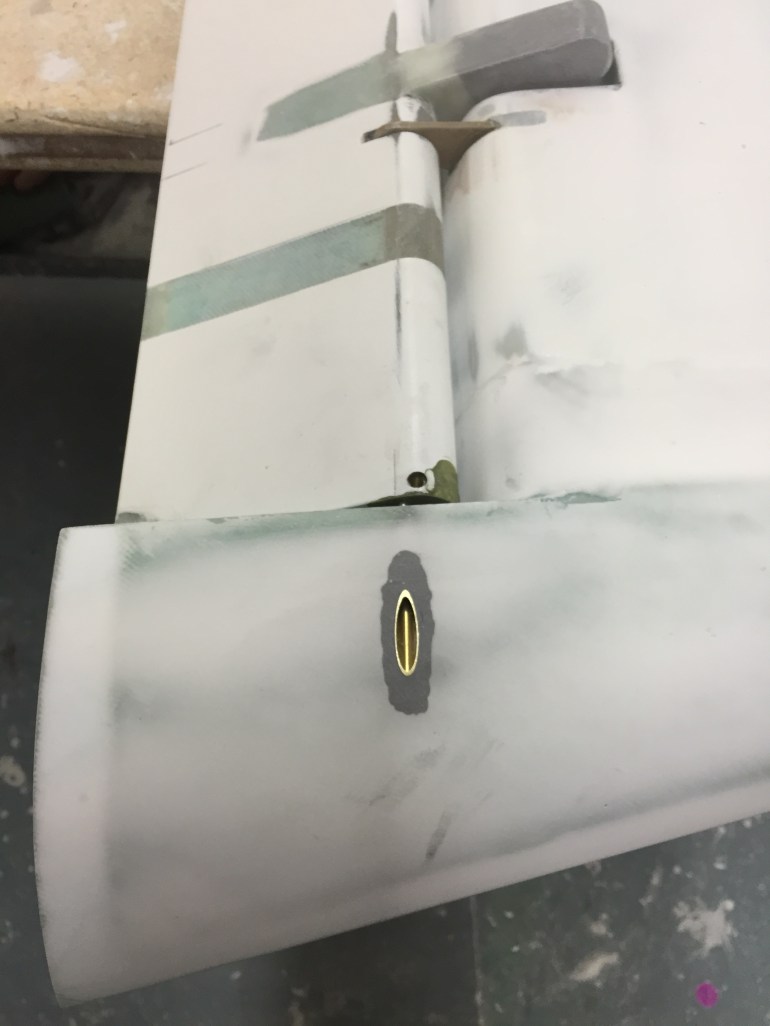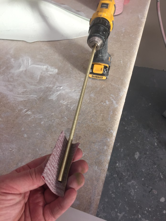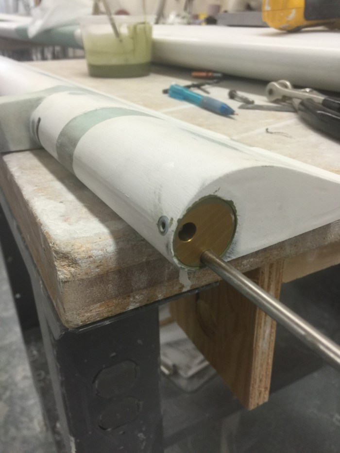 The plans call out to use a plastic tube in the tips as a closeout for the hinge pins. I couldn’t find the right size of plastic tube so I decided to use a brass tube that I had in my rc airplane building supplies. I used a drill to spin it and sanded it with some 120 grit sandpaper.
