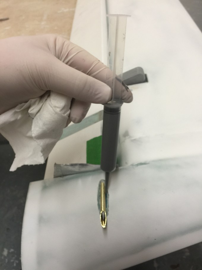 Because I was using a metal as the close out I chose to use some structural adhesive to bond it. I used a syringe to inject the adhesive and spun the insert to make sure the adhesive had made its way around the tube.